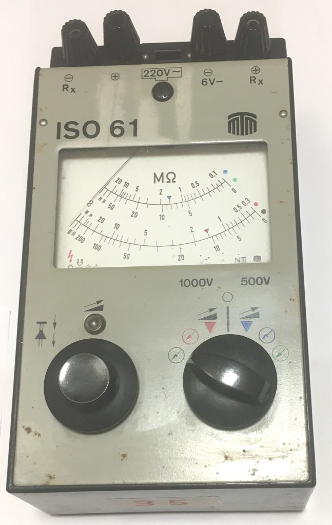 Beschreibung: Unersetzbarer Gerätetyp bei fast jeder Entstörung. Sehr gut durchdachtes und robustes Gerät.Bis heute noch gut einsetzbar. Die Messspannung ist zwischen 500 V u.1000 V wählbar. Jeder Spannungsbereich hat zwei einstellbare Messbereiche. Ein Netzeingang ermöglicht die Batterieladung. Eine einfache 6V Fremdeinspeisung ist auch vorgesehen.