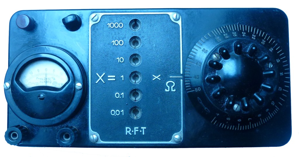 1. Dieses Meßgerät verzichtet auf die sonst bei derart nidrigen Widerstandswerten (0,04 Ohm minimal) üblichen Kelvin-Klemmen (Vierleiterklemmen). Trotzdem kann man mit +/- 1% noch ziemlich genau messen. Bei der Einstellung „*1000“ ist eine Anodenbatterie mit 60 Volt erforderlich, ansonsten dient eine eingelegte Flachbatterie (4,5V) als Stromquelle. Der Stöpsel fehlt fast immer, ein kleiner Messingbolzen tuts auch. Die Anschlußbuchsen an den Seiten korrodieren sehr leicht, besonders die daran befestigten Schaltkontakte im Inneren des Gerätes. Es ist bei Einspeisung von Wechselspannung (nur bis wenige 100 Hz sinnvoll) auch eine Widerstandsmessung mit Wechselspannung möglich. Dabei wird mittels Kopfhörer auf minimale Lautstärke abgeglichen. Im Gegensatz zu Schleifdrahtgeräten ist hier am Einstellrad ein Wendelpotentiometer eingebaut. Das bringt eine feinere Abstimmung und eine höhere Genauigkeit. Insgesamt ein gutes Gerät der damaligen Zeit, welches von einigen Herstellern über viele Jahrzehnte gebaut wurde.