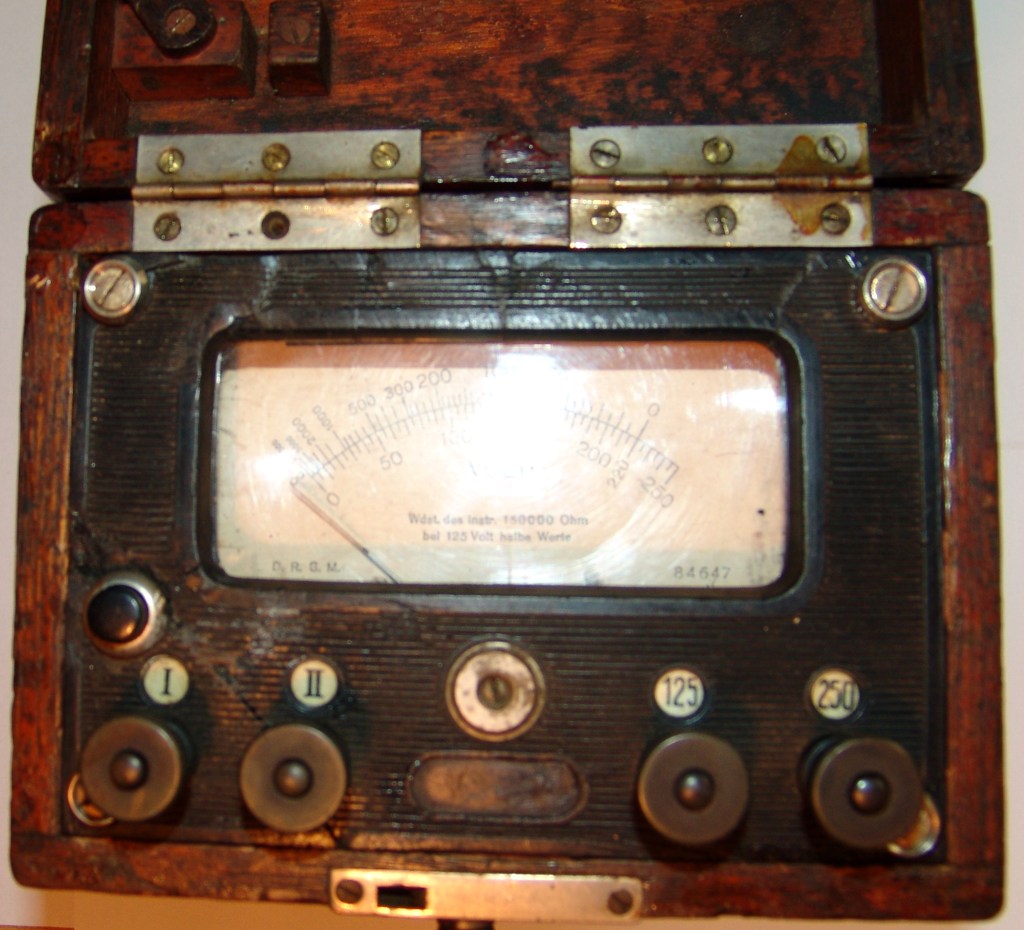 Zustand: Viel gebraucht und sehr verschlissen. Kurbel fehlt. Nach den Anschlußschrauben und der Verrieglung sowie der Bauweise des Induktors zu urteilen, stammt das Gerät noch aus der Nürnberger Hellerzeit. Heller wurde etwa 1905 von Felten u. Guilleaume übernommen. Das zerbröselnde Bakelit auf der Armatur scheint auch noch kein richtiges Bakelit zu sein. Bakelit wurde  erst 1909 als Patent angemeldet.