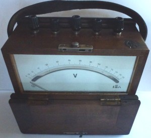 Ein sehr gut erhaltenes Voltmeter mit den Bereichen 15V, 150V, 300V u. 600V. Dieses Gerät war in den 20er Jahren bei der Deutschen Reichsbahn, vermutlich im Raum Essen, eingesetzt. Es trägt noch das alte D.R. Logo auf der Kontaktseite und am Trageriemen. Die Anzeige ist in der Horizontallage vorgeschrieben und  noch  genau. Das Messwerk hat einen sehr geringen Innenwiderstand.  Der  Messbereich „ 15V“  zieht bei Vollausschlag 250mA. Die Widerstandskombinationen sind als stoffisolierte Drahtwindungen auf Hartpapier gewickelt und paketförmig angeordnet. Die Anschlussklemmen sind nicht mehr original. Diese stammen aus den 50er Jahren.