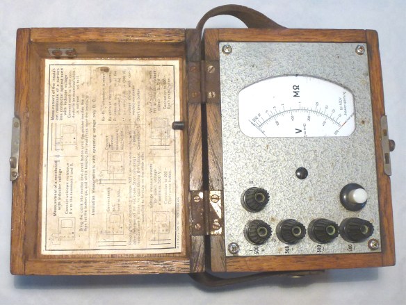 Beschreibung: Gerä aufgearbeitet, Skale erneuert , Funktionsprobe konnte nicht ausgeführt werden. Es ist ein Gerät, das 500V – u.~ Spannung ausgibt und dabei einen Isolationswert von < 50 Megaohm anzeigen kann. Die Beschreibung im Deckel ist in engl. Sprache gedruckt. Es kann als Generator und als Messinstrument genutzt werden.