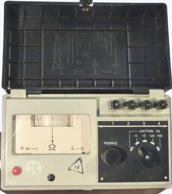 Beschreibung: Ein kleines leichtes Gerät. Est besteht aus einem PE Gehäuse und kann mit seinem Deckel verschlossen und wie eine Handtasche getragen werden. Mit dem Stufenschalter können die Widerstandswerte vorgewählt und mit dem Regler erfolgt die Feinabstimmung. Im Deckel steht die Anschlußbeschreibung. Es ist ein robustes, einfach bedienenbares Gerät im besten Zustand. Drei Monozellen bilden die Stromversorgung.