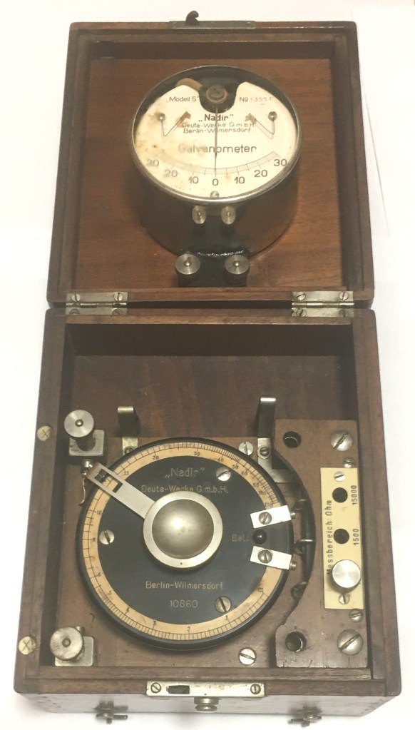 Beschreibung: Es ist eine Messbrücke in Wheatstone Schaltung mit drei Messbereichen 150, 1500 u.15000 Ohm. Diesem Gerät ist ein Galvanometer zum genauen Brückenabgleich beigefügt und es ist separat anzuschließen. Die Batterie ist von oben Einklemmbar. Die Messbereiche werden durch „stöpseln“ ausgewählt.