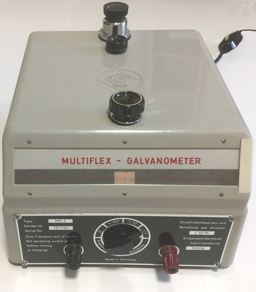 Beschreibung: Sehr gut aussehend und funktionsfähiges Galvanometer mit einer Empfindlichkeit von 4X10 hoch -9 A und einem Eingangswiderstand von 1300 Ohm. Es ist für 110V, 220V Betriebsspannung ausgelegt und kann auch mit 4V betrieben werden.