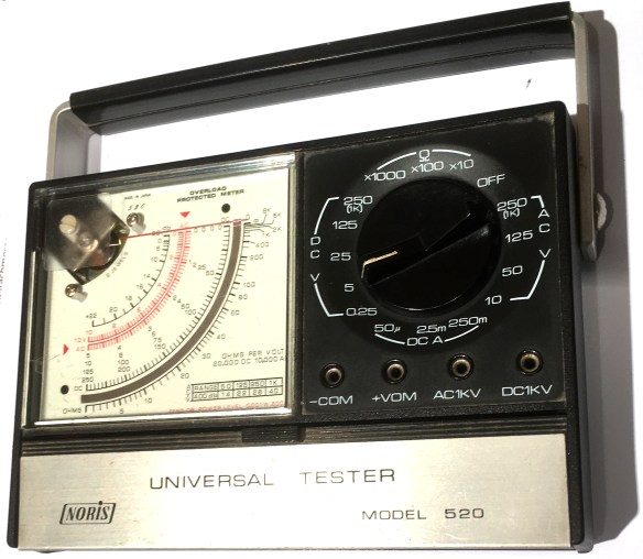 Beschreibung: Das Gerät ist für Messungen von Strom, Spannung, Widerstand und Kapazität ausgelegt. Seitlich sind Schalter und Regler angebracht.Leider ist das Gerät teilweise defekt. Die Spannungsanzeige konnte ich noch aufarbeiten, aber Strom und Widerstand nicht. Die Poolkappen der Widerstände sind teilweise lose und einige Widerstandswicklungen unterbrochen. Obwohl es dieses Gerät kaum noch gibt und es nahezu unbeschädigt ist, lohnt sich der Arbeitsaufwand nicht mehr. Ein typgleiches Gerät, aber nur für Messungen von Strom u. Spannung ist noch im Umlauf.