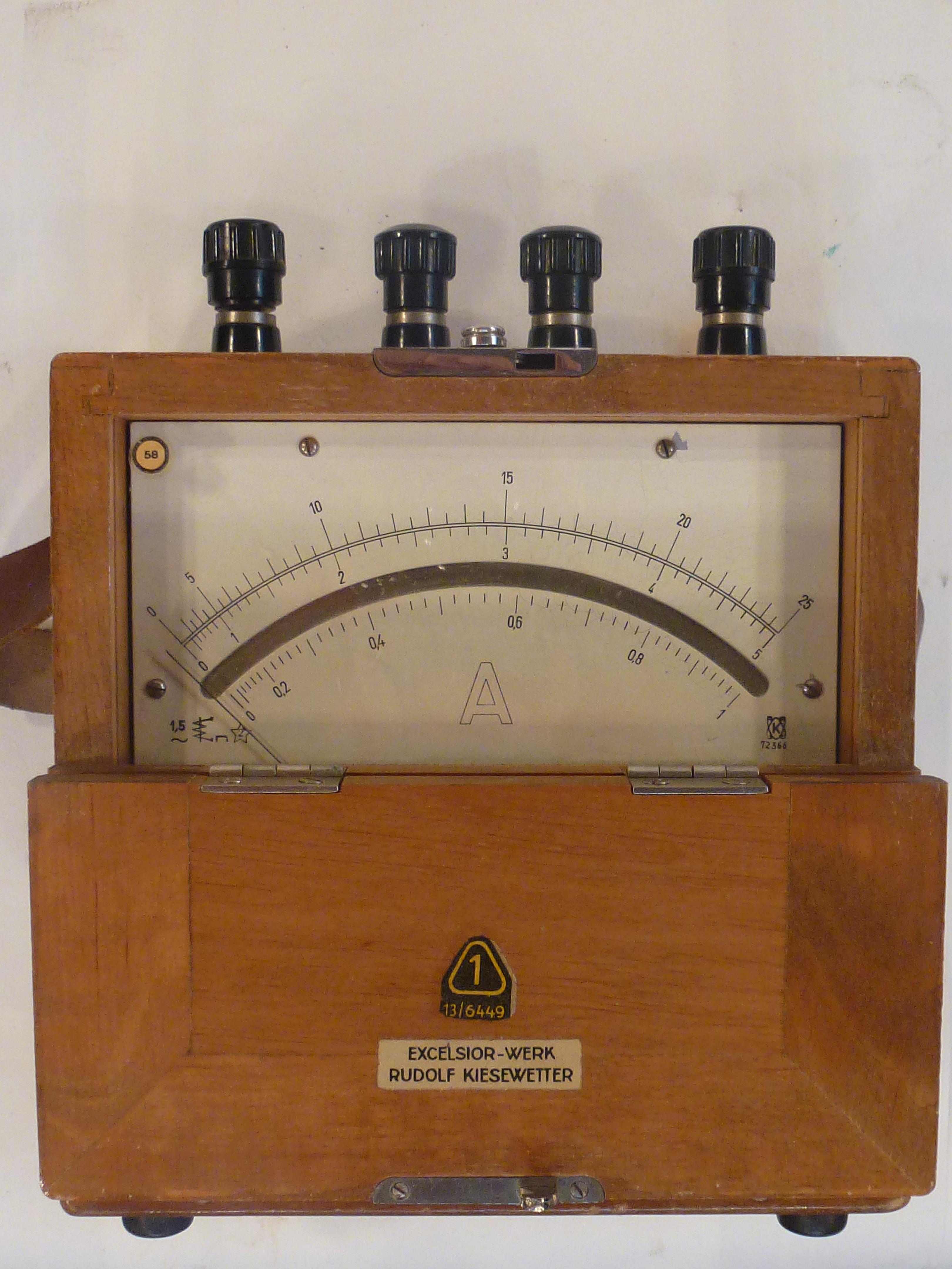 Zustand: Dieses Gerät ist noch einsatzfähig und befindet sich in einem dem Alter entsprechend sehr gutem Zustand. Es ist für einen bestimmten Einsatz hergestelltes Präzisionsdrehspul-Messgerät. Seit 1898 definiert man den Strom als Maßeinheit. Das bedeutet, der Strom hat eine Stärke von 1Ampere, wenn er bei einer Elektrolyse in einer Sekunde 1,118mg Silber aus einer wässrigen Silbernitratlösung abscheidet. Heute wird die gleiche Stromstärke über eine genaue Lorentzkraft definiert.