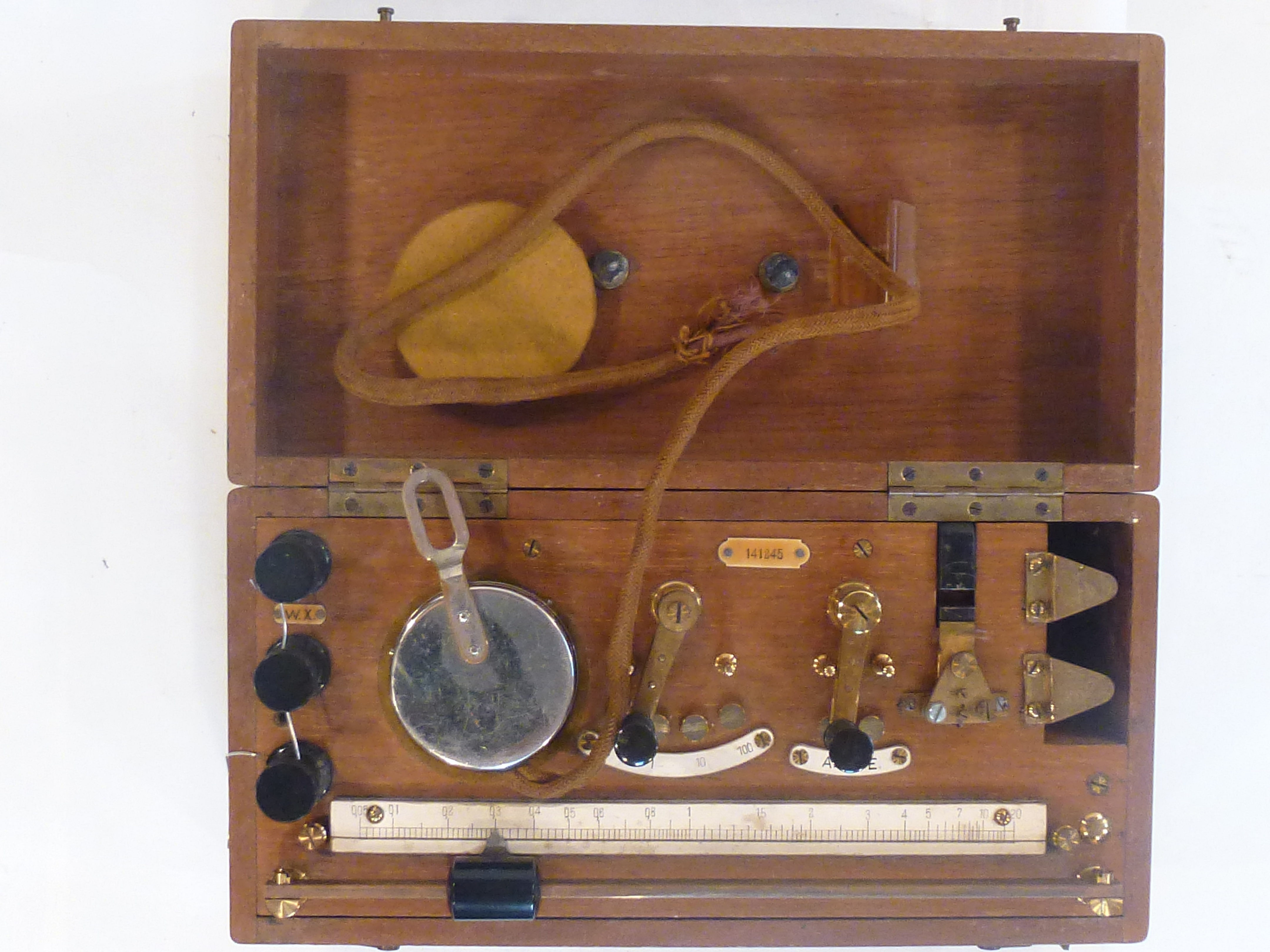 Zustand: Bestzustand und noch funktionsfähig, untergebracht in einer original Tragekiste aus Holz mit außenliegenden Anschlüssen. Alle Stöpsel vorhanden. Messbereich: von 0,5 bis 5000 Ohm. ACCU- Spannung 6V Strom etwa 100mA . Prinzip: Bekanntes Brückenprinzip, das für feste ohmsche Werte aber auch für die Widerstandsermittlung von Flüssigkeiten eingesetzt werden konnte. Für die Festwerte wurde ein Galvanometer als Indikator wahlweise angeschlossen. Ein selbstunterbrechender Generator induzierte eine Wechselspannung die bei beweglichen Widerstandswerten, wie zB. Flüssigkeiten, bei Abgleich im dafür angeschlossenen Kopfhörer einen Schwebungs- Nullpunkt erzeugte.